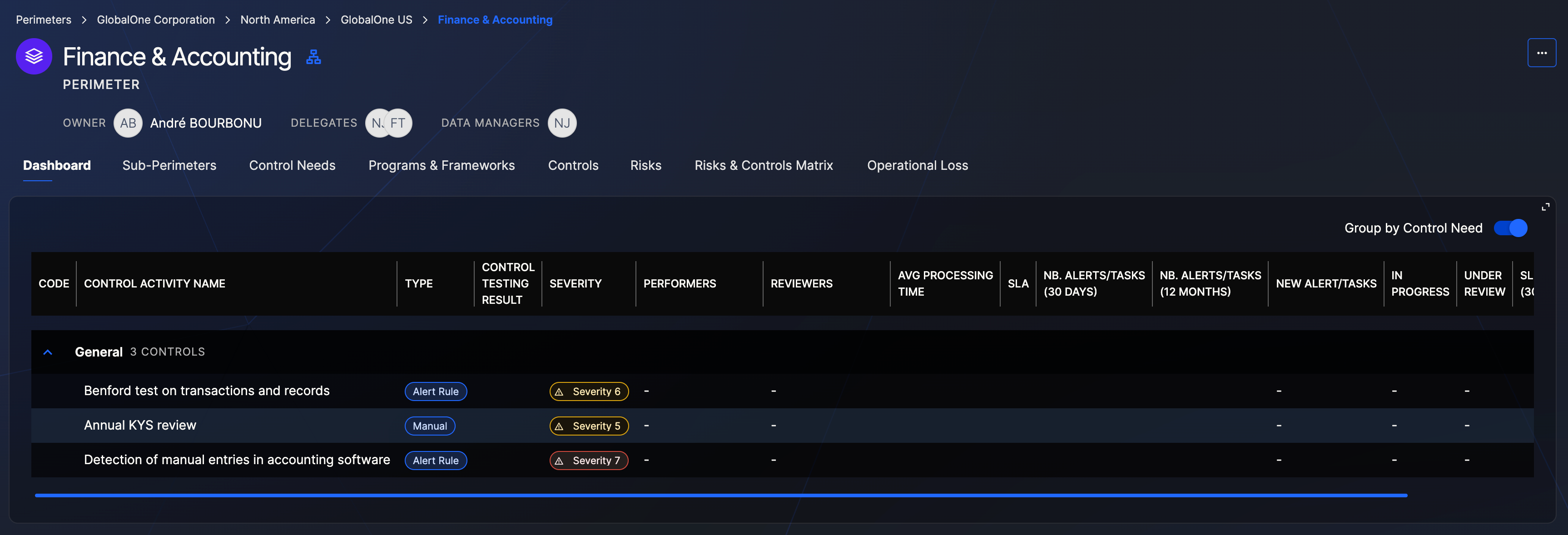 Start by creating Perimeters that reflect your organizational structure — departments, sub-departments, teams, or any unit that needs its own control scope. Assign members (Owners, Delegates, Data Managers, Performers) to each Perimeter to define who can manage controls and who processes alerts and tasks.