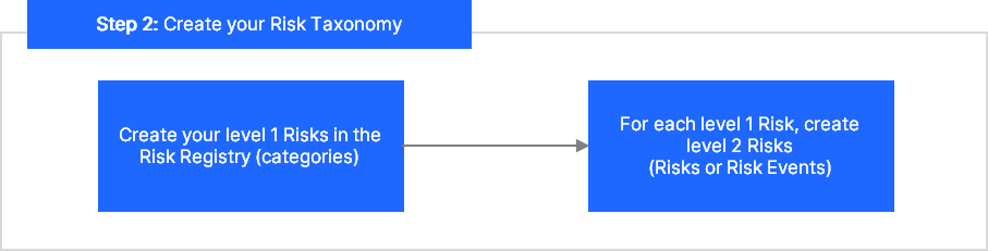 The next recommended step is to create your Risks Taxonomy/Registry. We recommend a 2-level Taxonomy with Risk Categories as level 1 and Risks/Risk Events as level 2.