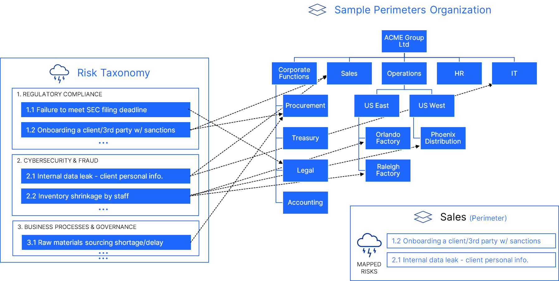If you don't necessarily want to leverage an existing framework (NIST, COBIT, COSO, etc.) or create your own internal framework, you can directly map your Risks to your Perimeters.