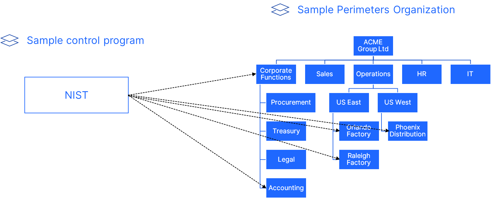 You can find an example of an organization below, each box representing a Perimeter.