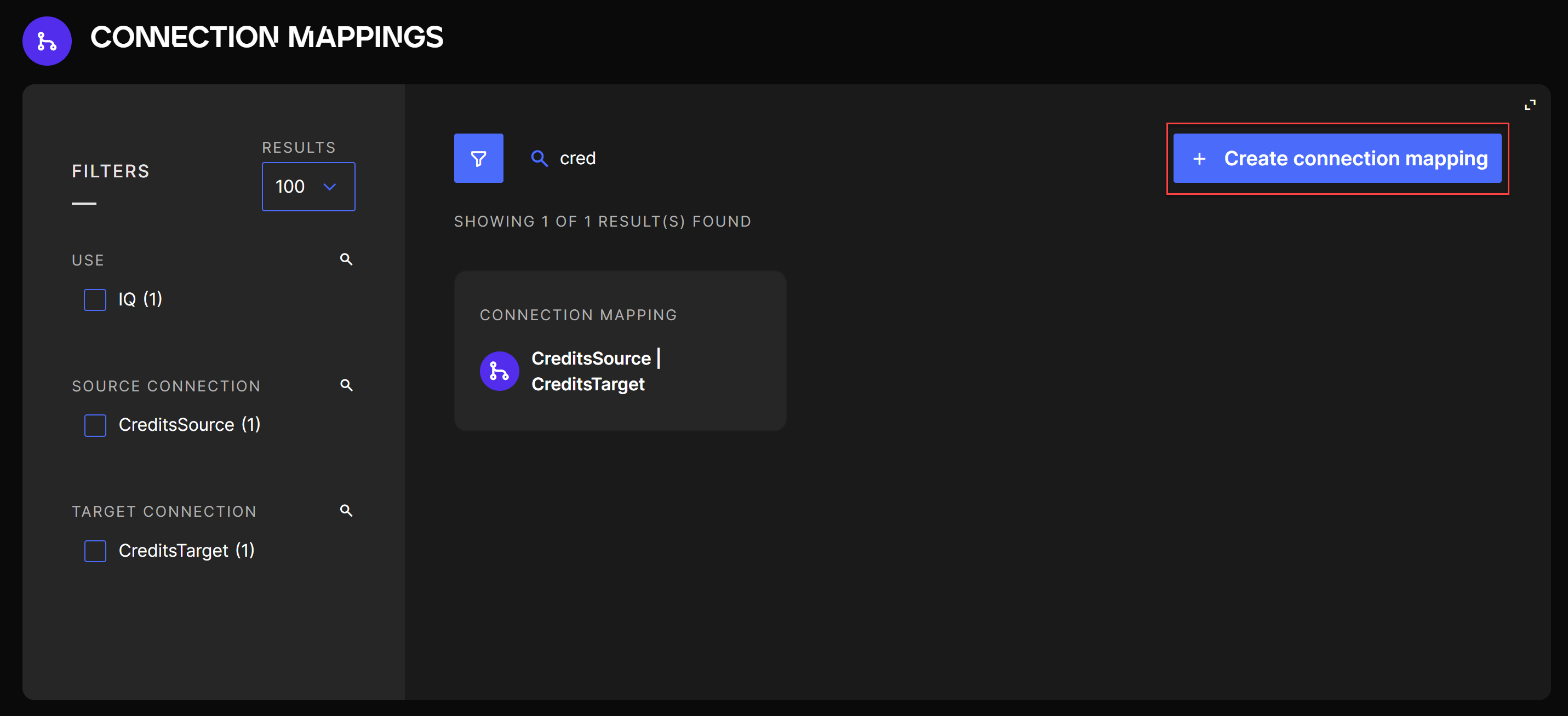 You should now see a list of all Connection Mappings already configured in the application. You can also use filters to find a specific Connection Mapping or use the search bar to search by name (each Connection Mapping contains the name of the Source Connection and the Target Connection).