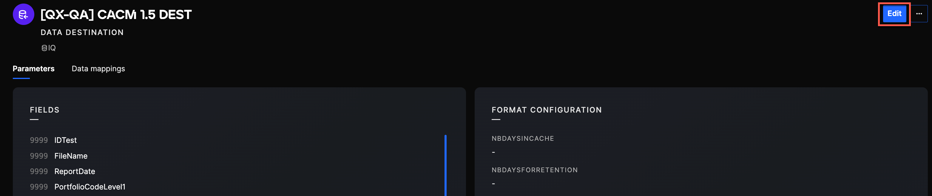 In order to modify an existing Data Destination, you can navigate to the Data Destination using the method described in the section above. You can easily change its fields and format configuration using the Edit button.